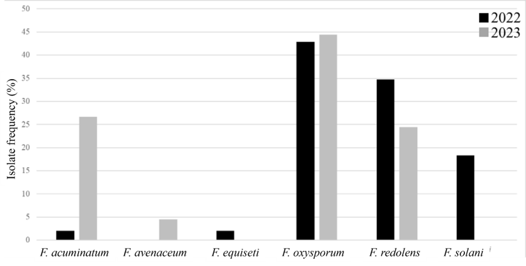 Fusarium pathogens were isolated from diseased roots and then identified using DNA sequence analyses. We found that Fusarium oxysporum was the most frequently isolated species, accounting for 43% of all Fusarium isolates identified in 2022. This was followed by Fusarium redolens (35%), Fusarium solani (18%), and Fusarium acuminatum (2%) and Fusarium equiseti (2%). In 2023, F. oxysporum was, again, the most frequently isolated (44%), followed by F. acuminatum (27%), F. redolens (24%), and F. avenaceum (4%) (Figure 2).
