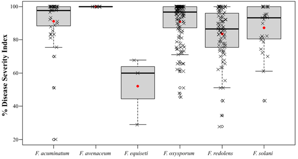 Figure 3. Fusarium root rot severity from greenhouse infection assays of individual isolates from 2022 and 2023 surveys across 3 experimental trials. Number of individual strains tested: F. acuminatum 13, F. avenaceum 2, F. equiseti n 1, F. oxysporum n 41, F. redolens n 28, and F. solani n 9. Means and individual DSI values are denoted by red circles and ‘×’, respectively. Each “x” reflects an average of the 15 plants evaluated in the three experiments.