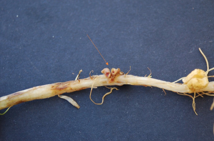 Figure 7. Nitrogen-fixing pea nodule that has been damaged by pea leaf weevil larvae feeding and has become infected with other soilborne organisms (Photo: Lyndon Porter).