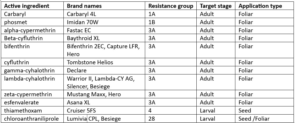Table 1. List of registered products labeled to manage pea leaf weevil. Check labels to ensure products are registered for your area (not a comprehensive list of all potential products).
