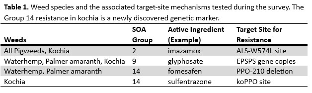 If you stayed this far into the blog post, it is now time to discuss the limitations of the DNA tests used in this survey. NAGC provides confidential reports to submitters who may see a ‘wildtype’ result at the Group 2, 9, or 14 resistance markers. This just means that the specific target-site mutation NAGC detects was not present in the submitted weed. Herbicide resistance can arise due to other target-sites in the genome, including ones still needing to be discovered or other sites not tested by NAGC. Complicating matters are the metabolic or non-target-site mechanisms that cannot be detected by a simple DNA test. Therefore, greenhouse herbicide trials remain the gold standard for detecting all forms of herbicide resistance.