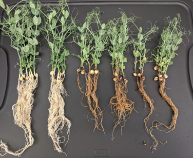 Pulse crops such as lentil and dry edible pea have been an excellent rotation crop in dryland Montana, as well as other states and provinces in North America. This is due both to benefits to the cropping system such as nitrogen fixation, low water use, and breaking up pest and disease cycles in wheat as well as increasing farm profitability. In years with high pea and lentil prices, growers prefer to plant pulse crops due to the excellent return on investment. With frequent cropping of pulse crops, however, there has been a rise in the reports of root rot problems in dry pea and lentil fields. Multiple pathogen species can contribute to root rot issues on pulses, so it is referred to as a ‘root rot complex’. One of the major players in this complex, Aphanomyces euteiches, which causes Aphanomyces root rot, is particularly difficult to manage. The pathogen produces spores that can survive for many years in the soil and there are limited management options available for pulse growers. Below ground symptoms include root browning, root constriction, fewer nodules, smaller nodules, and a reduction in lateral roots (Figure 1).