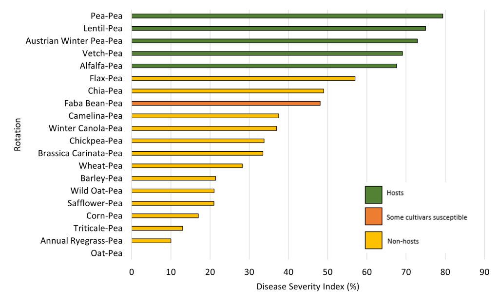 Growing legumes that are susceptible to Aphanomyces root rot, ‘host plants’, led to more disease on subsequent dry pea plants compared to cereals, oilseeds, flax, brassicas, and weed species. Austrian winter pea (AWP) was affected by the pathogen under the warm greenhouse condition, however, in the field it is often too cold when AWP is growing for Aphanomyces root rot to establish. The ‘oat’ rotation was noticeably successful at reducing disease on dry pea in these controlled conditions. There is a compound in oat that causes the root rot spores to break open and disintegrate, decreasing the longevity of the pathogen. In field trials conducted in other states where oat was grown prior to pea, a reduction of root rot was found compared to treatments where oat was not grown.