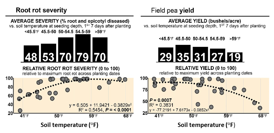Planting field pea early conferred average yield gains of 4 to 8 bushels/acre across multi-year, multi-location studies conducted in fields with significant Aphanomyces and Fusarium root rot pressure. In planting date studies conducted from 2017-2020 at Carrington and on-farm sites in west-central and northwestern North Dakota, root rot increased sharply with delays in planting. Root rot severity was minimized when peas were planted into soils that averaged (across day and night) less than 50°F at 2 inches seeding depth in the 7 days after planting (Figure 1). Consequently, yield also improved. Planting within these target soil temperatures is possible with knowledge of current daytime and nighttime temperatures combined with the current 7 to 10-day forecast.