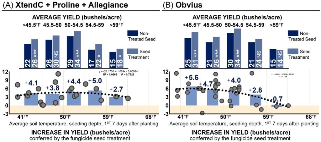 Figure 2. Performance of non-treated seed versus seed treated with A) XtendC + Proline + Allegiance (0.38, 0.26, 0.25 fl oz/cwt) or B) Obvius (4.6 fl oz/cwt) in terms of field pea yield relative to soil temperature in the 7 days after planting. Data are from field trials conducted from 2019 to 2022 in fields with elevated Fusarium and Aphanomyces root rot across four locations in North Dakota. Bar graphs show the average response relative to soil temperature observed across all studies. Scatter plots show the results from individual replicated studies or replicated planting dates within a planting date study.